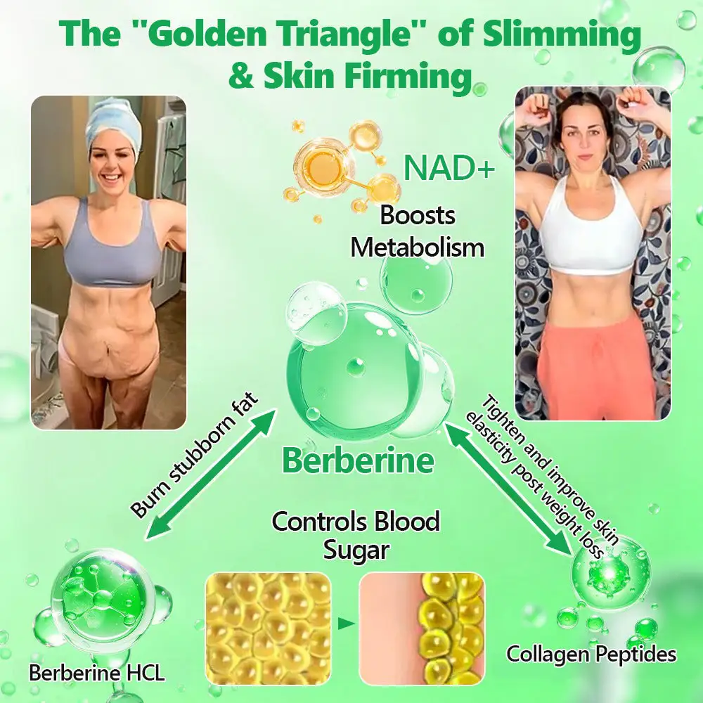 Collagen Peptides strengthen skin structure, reduce fine lines, and improve elasticity. NAD+/NMN stimulate cellular repair and collagen synthesis, while Omega-3 locks in moisture and improves skin smoothness. Green Tea Extract and Turmeric protect skin from oxidative stress and inflammation, slowing visible aging. Magnesium supports skin repair and hydration balance, while Silymarin provides detoxifying effects that brighten complexion. This synergistic formula helps lift sagging skin, smooth wrinkles, and restore a youthful glow after weight loss.