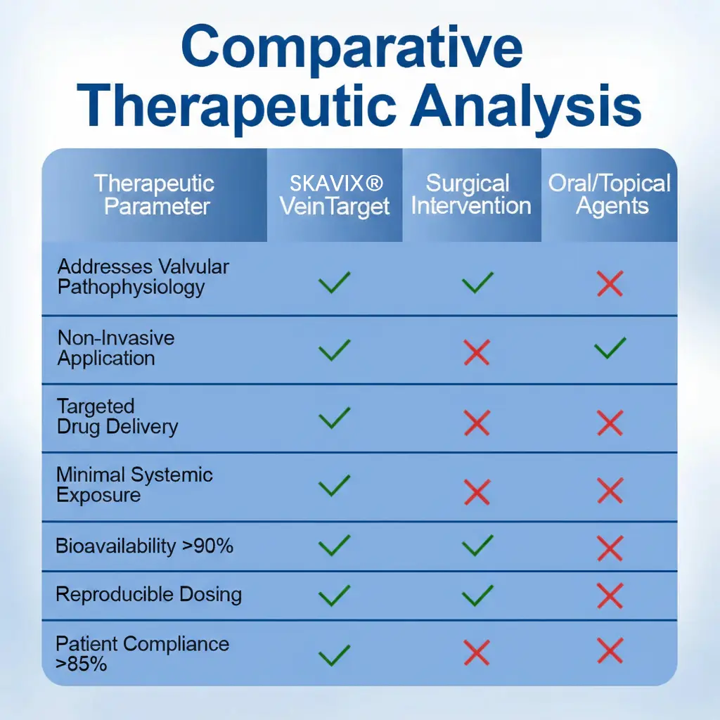 Skavix® VeinTarget represents the first commercially available transdermal phytotherapy system specifically designed to address venous valvular insufficiency through localized botanical intervention. Unlike systemic treatments that dilute active compounds throughout the circulatory system or topical applications that cannot penetrate the dermal barrier, our microneedle delivery system ensures concentrated therapeutic compounds reach the target tissue with minimal systemic exposure.